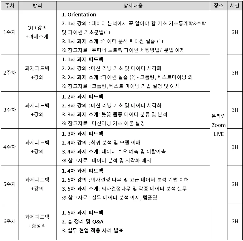 진행되는 총 주차 및 주차 별 시간은 주제 및 내용에 따라 코디와 협의하여 정합니다.